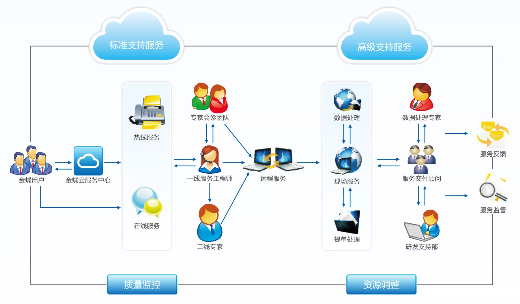 高級(jí)支持服務(wù)是指金蝶提供的現(xiàn)場支持服務(wù)和專屬服務(wù),是對標(biāo)準(zhǔn)服務(wù)的升級(jí)和補(bǔ)充。其中,現(xiàn)場支持服務(wù)是指以赴客戶現(xiàn)場的方式進(jìn)行問題斬?cái)嗪吞幚?、?yīng)用指導(dǎo)及答疑等;專屬服務(wù)指針對客戶量身定制的高端服務(wù),包括綠色通道服務(wù)、緊急救援服務(wù)及顧問駐場服務(wù)。